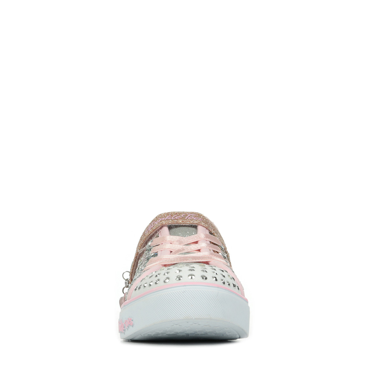 Illuminez chacun de vos pas avec romantisme. Cette chaussure à enfiler avec une tige en tissu étincelant iridescent et un tissu à fini scintillant, est dotée d’un bout agrémenté de strass et d'une breloque en forme de coeur.