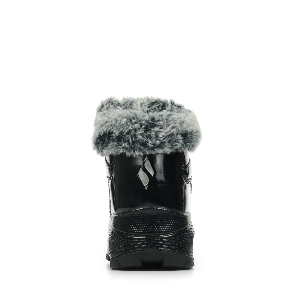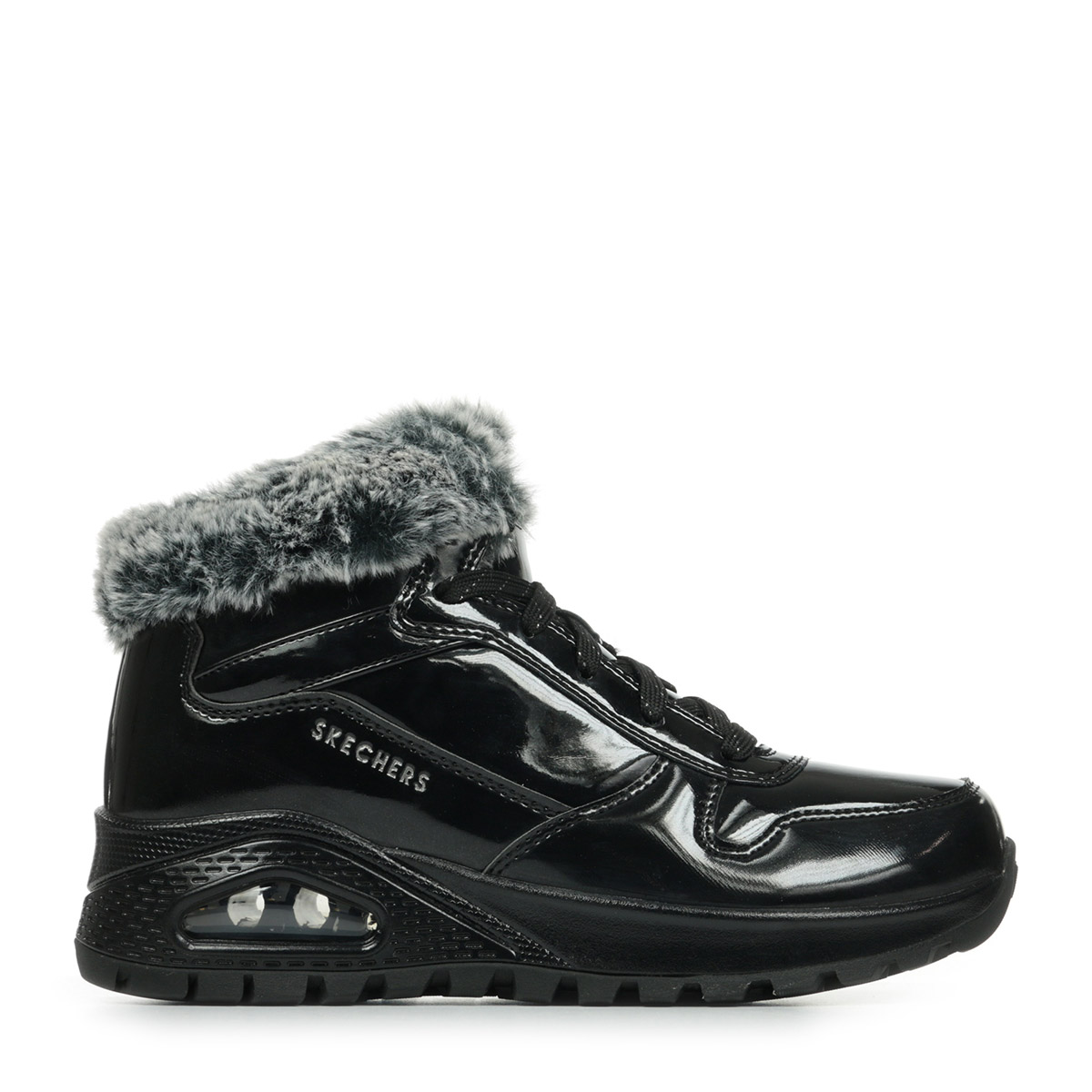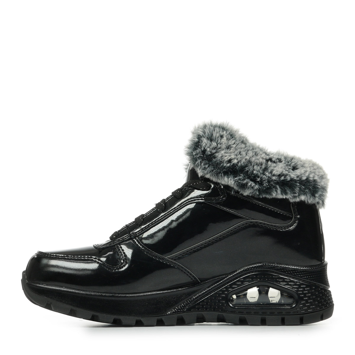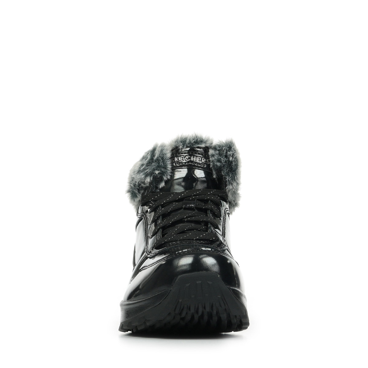 Cette chaussure de sport à lacets est dotée d'une tige en synthétique verni avec des bordures en fausse fourrure, d'une semelle intérieure en mousse à mémoire de forme Skechers Air-Cooled et d'une semelle intermédiaire Skech-Air à coussin d'air visible.