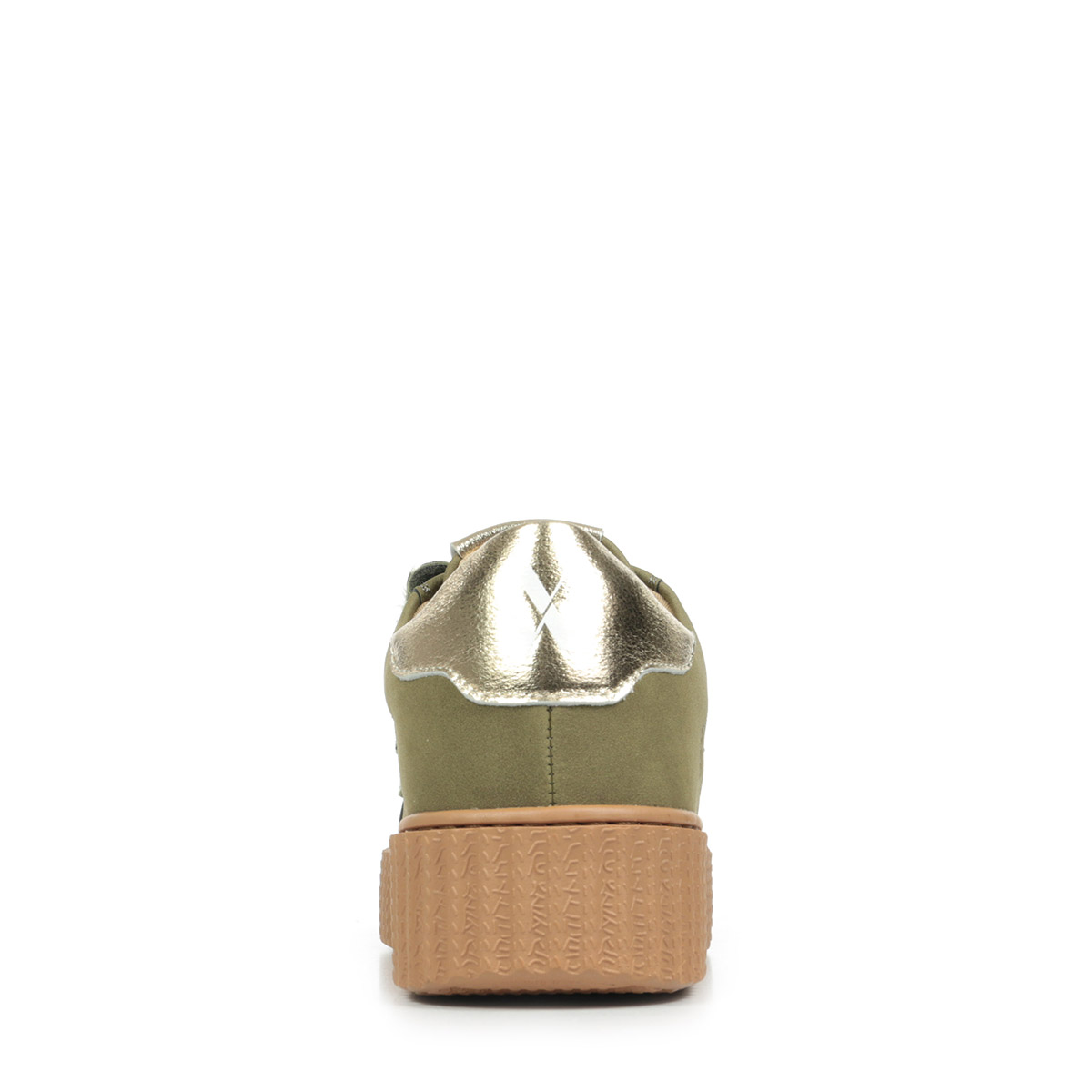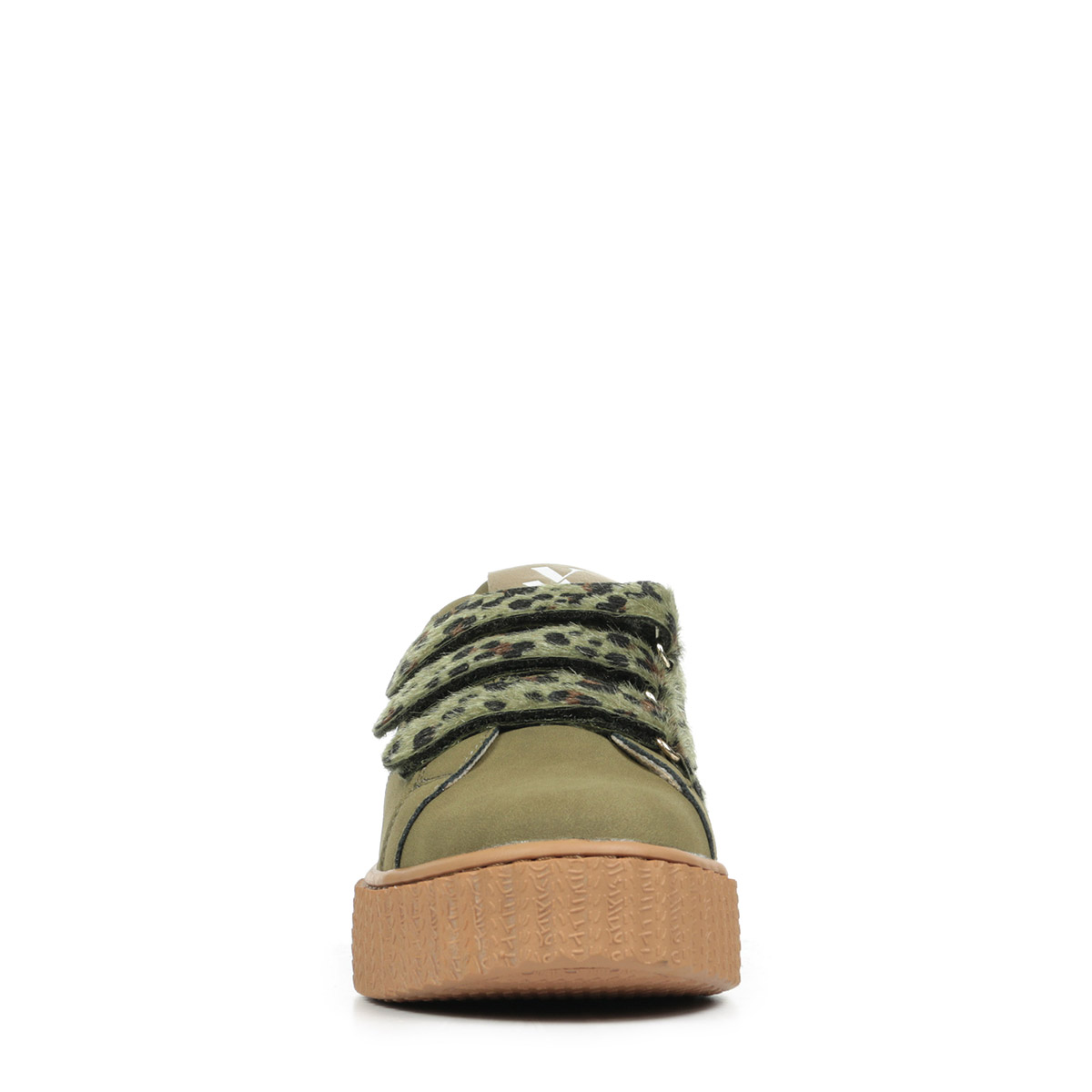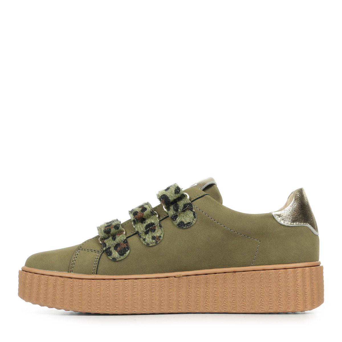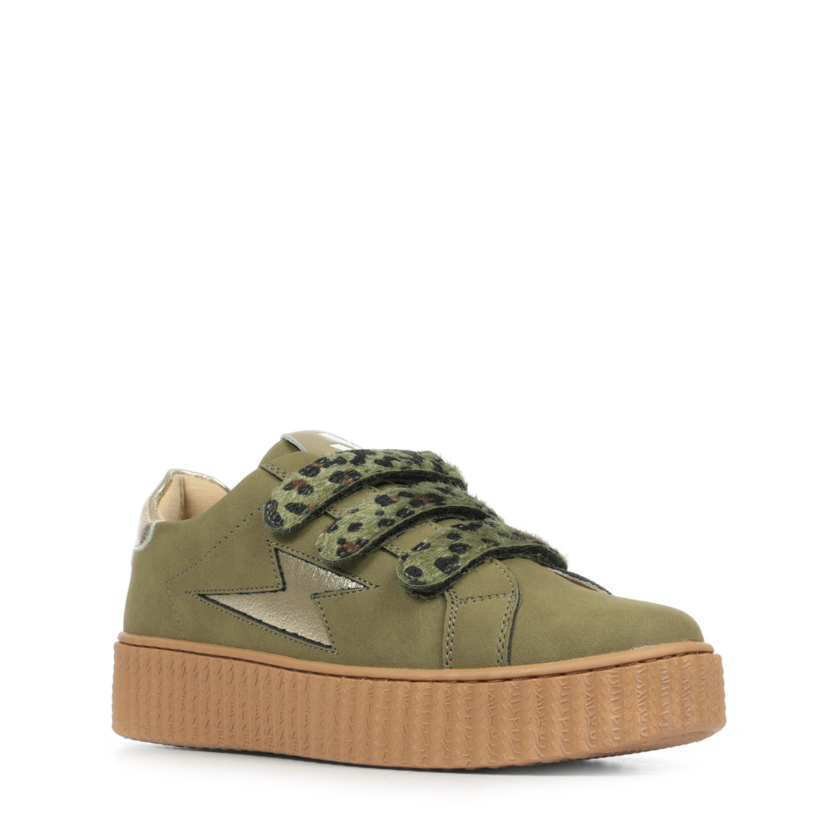 Plus produit : - Découpe en forme d'éclair et patch arrière en cuir synthétique texturé or - Fermeture à scratchs en suédine kaki imprimé léopard bronze métallisé - Bout rond - Semelle creepers camel