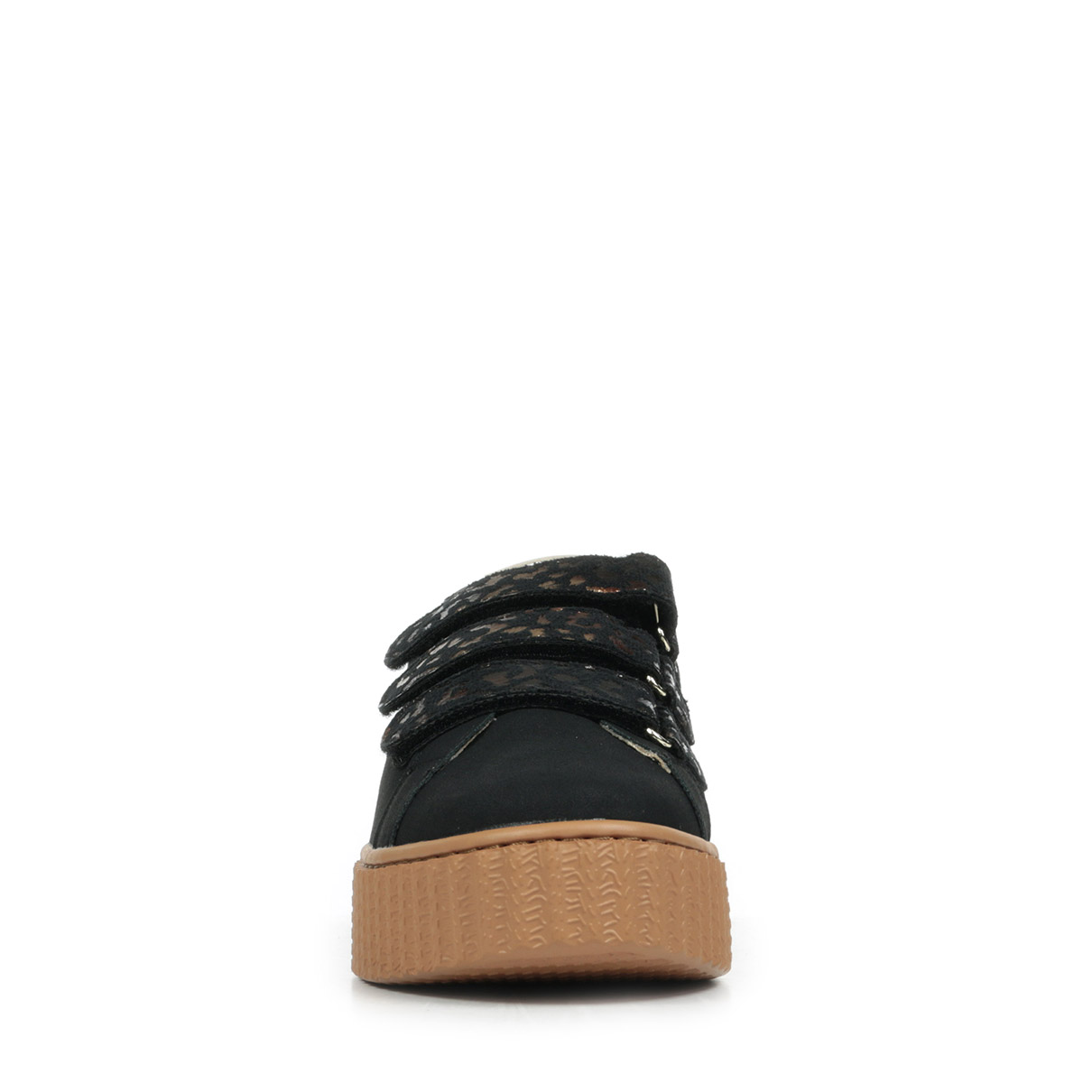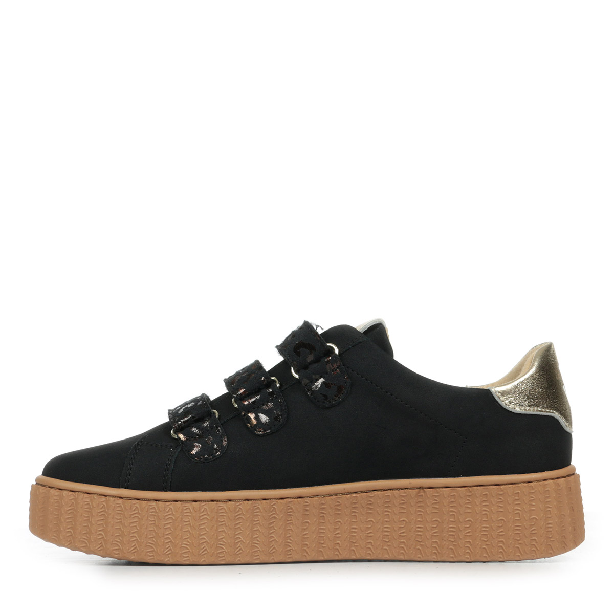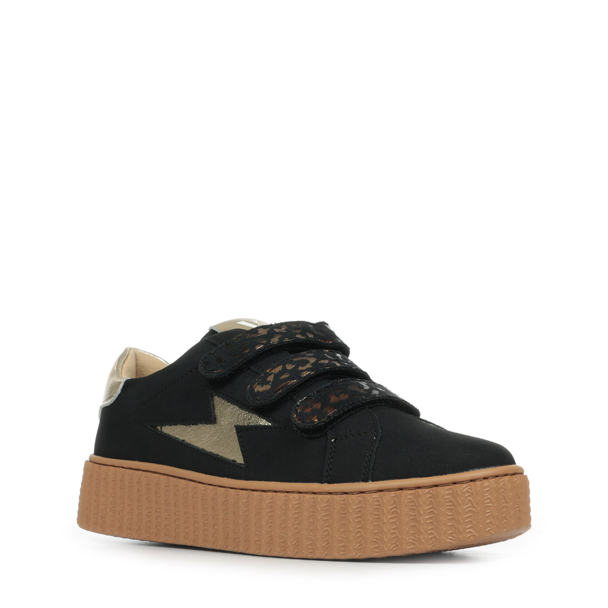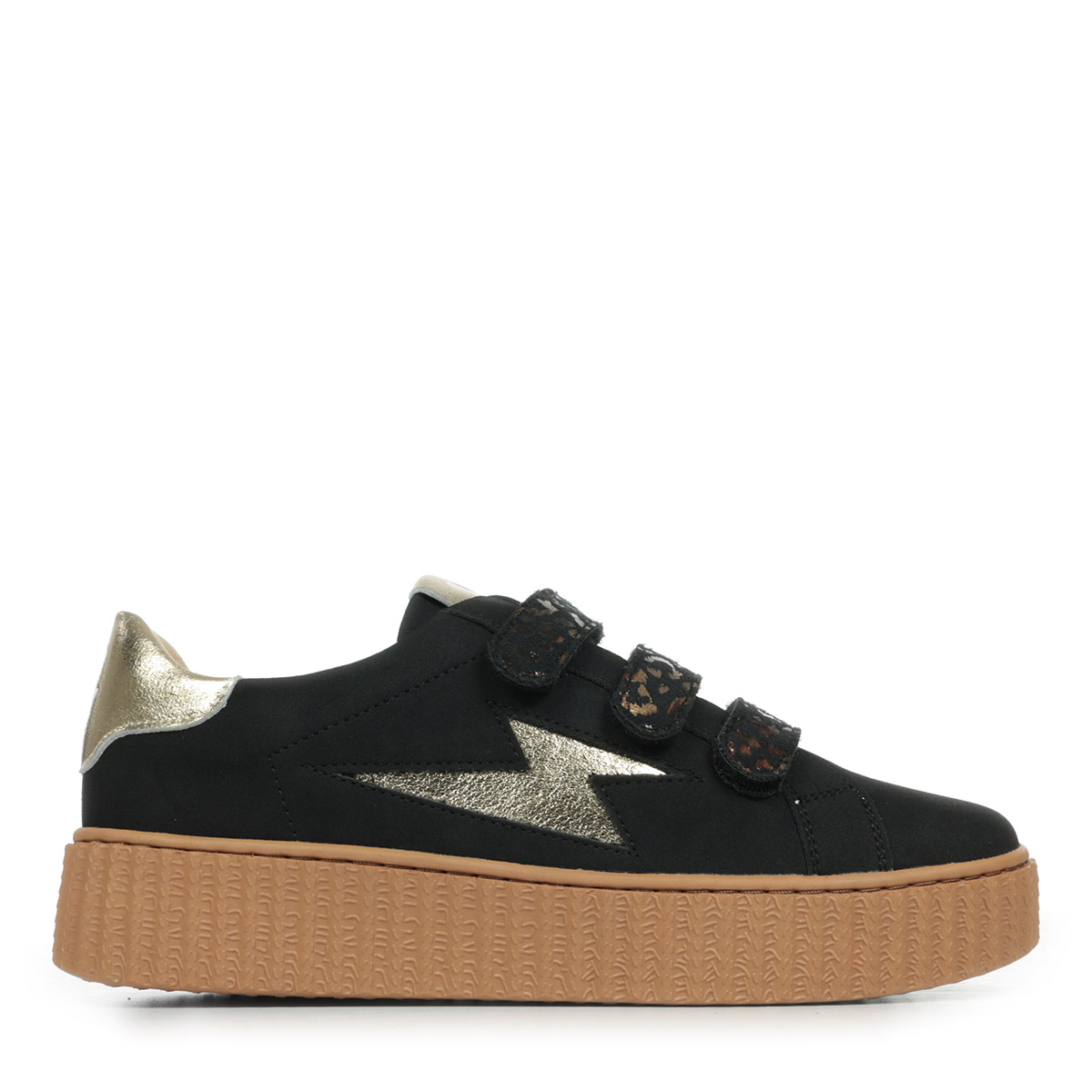 Plus produit : - Découpe en forme d'éclair et patch arrière en cuir synthétique texturé or - Fermeture à scratchs en suédine noire imprimé léopard bronze métallisé - Bout rond - Semelle creepers camel