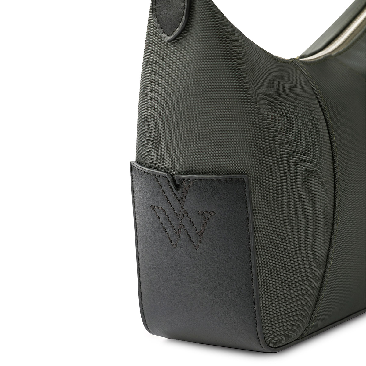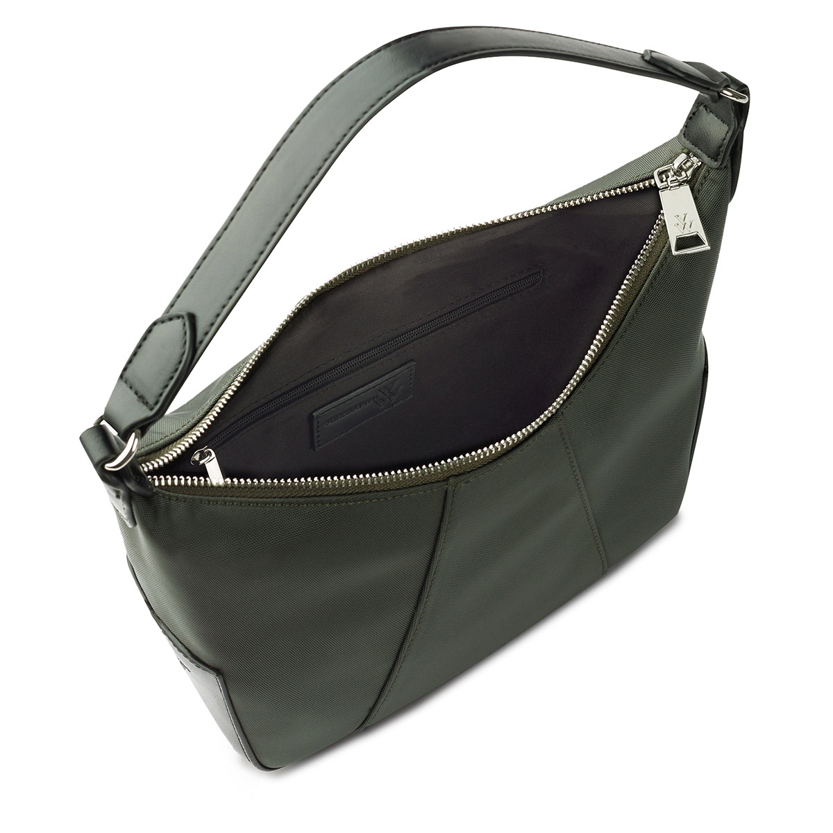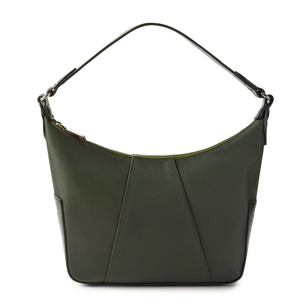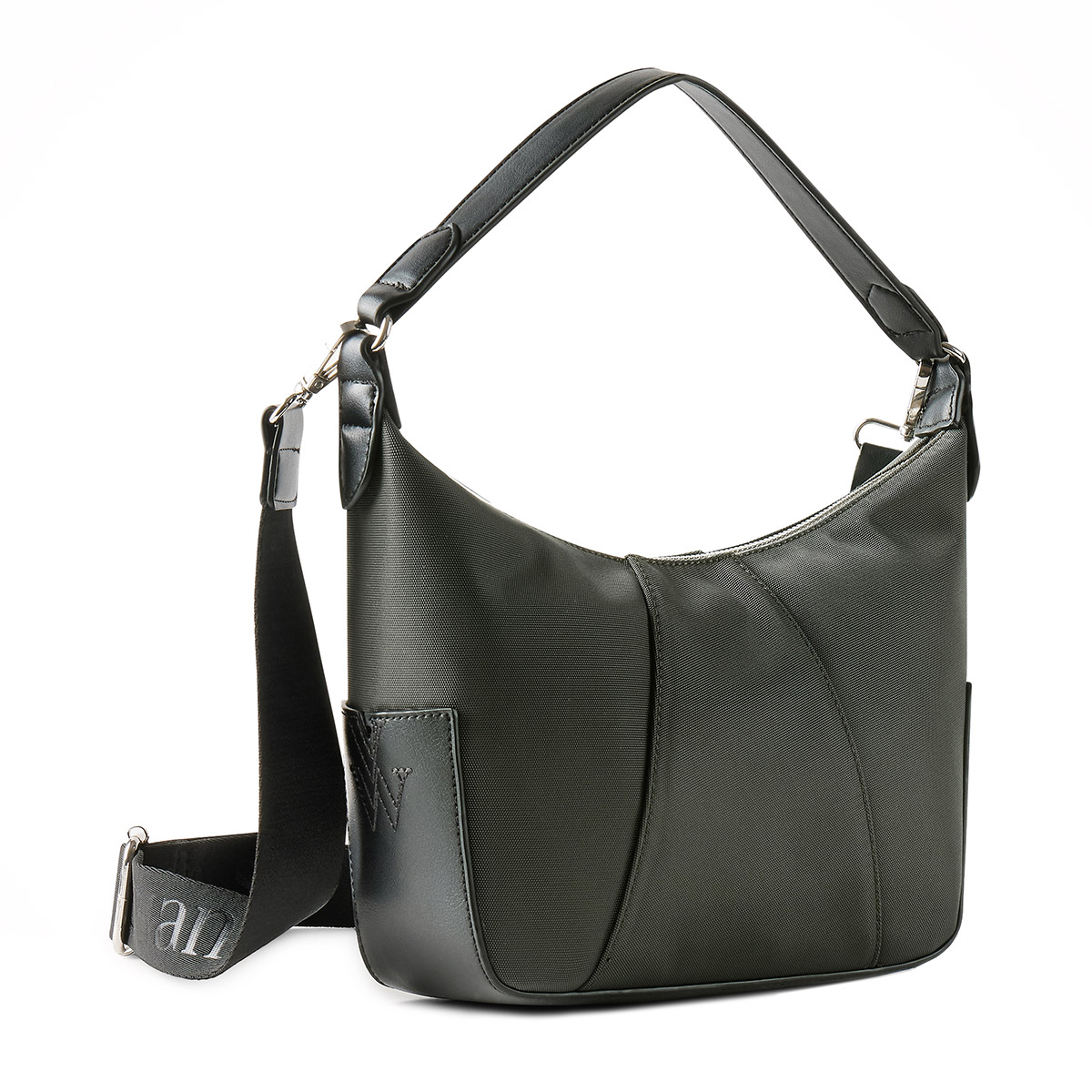 Petit sac hobo en nylon noir. Fermeture éclair argentée. Compartiment intérieur avec une poche plaquée ouverte et une poche plaquée à fermeture éclair. Fond de sac rigide et débordant en similicuir noir. Anse non réglable en similicuir noir à boucles argentées. Bandoulière en tissu noir avec logo embossé, boucles et mousquetons argentées.