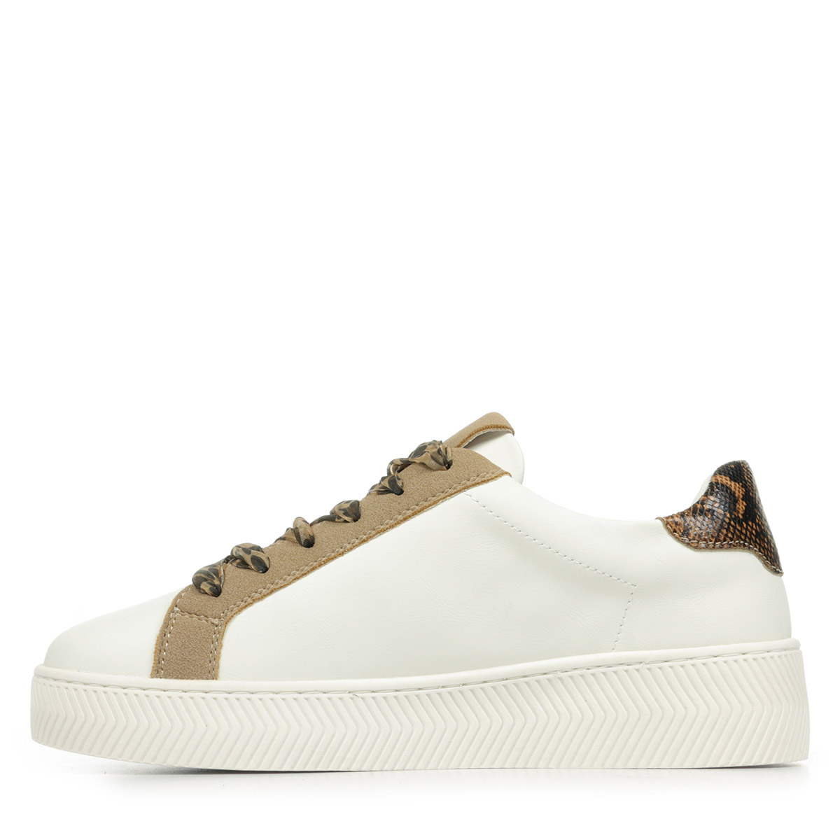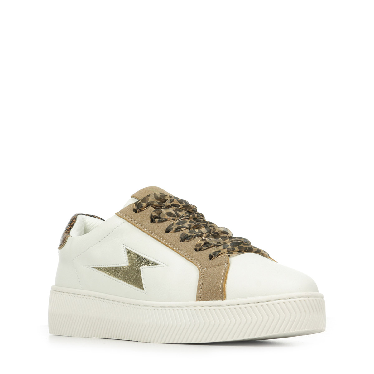 Plus produit : - Tige cuir synthétique blanc - Découpe en forme d'éclair et contrefort en cuir synthétique texturé or champagne - Fermeture lacets nylon en motif léopard - Patch arrière en synthétique motif serpent - Bout rond - Semelle épaisse blanche à motifs chevrons