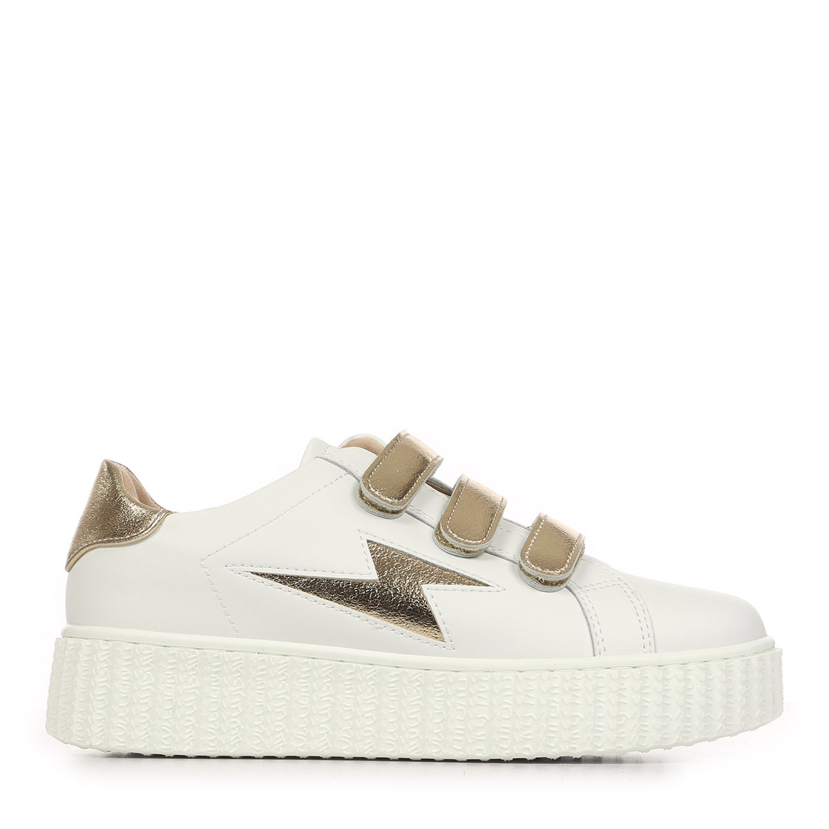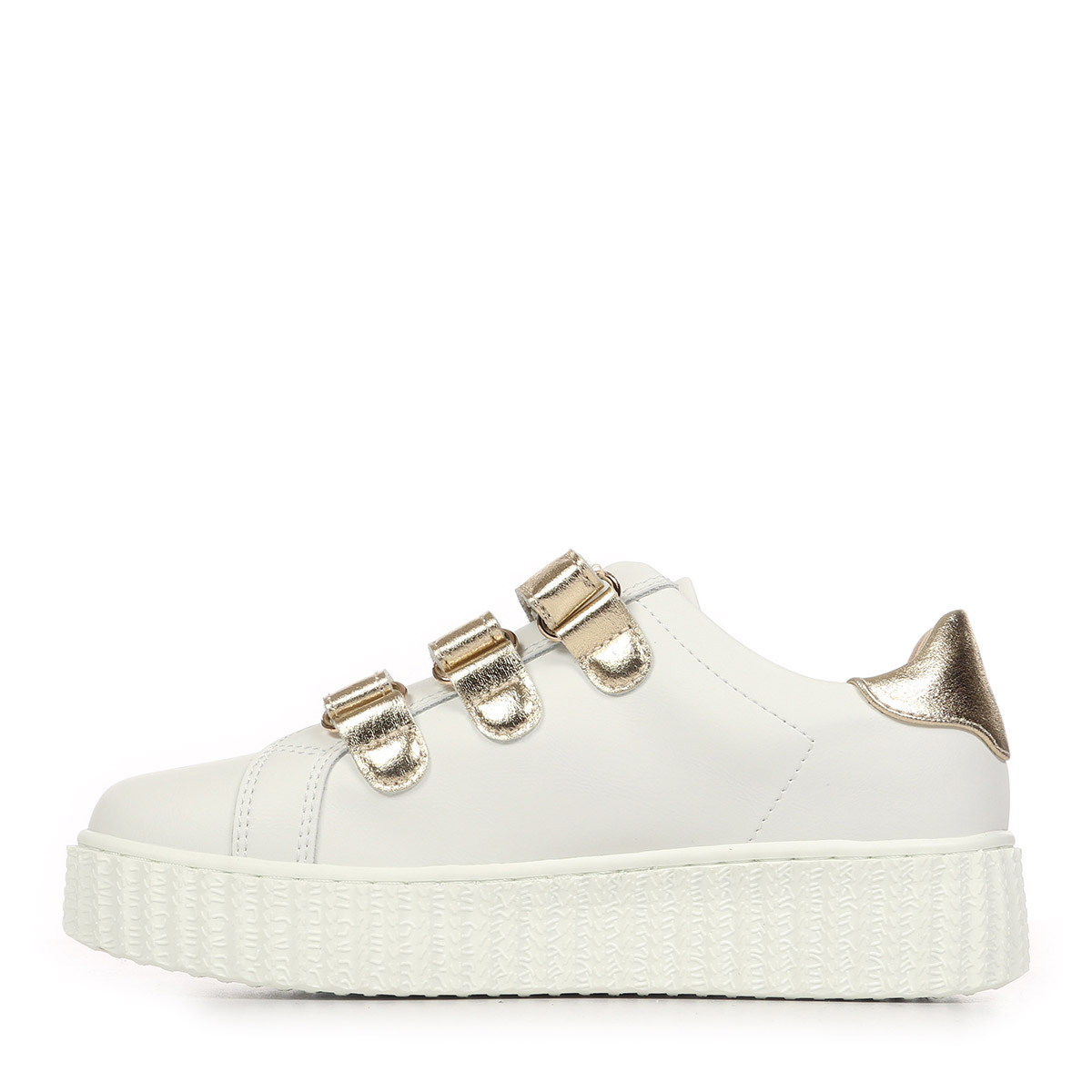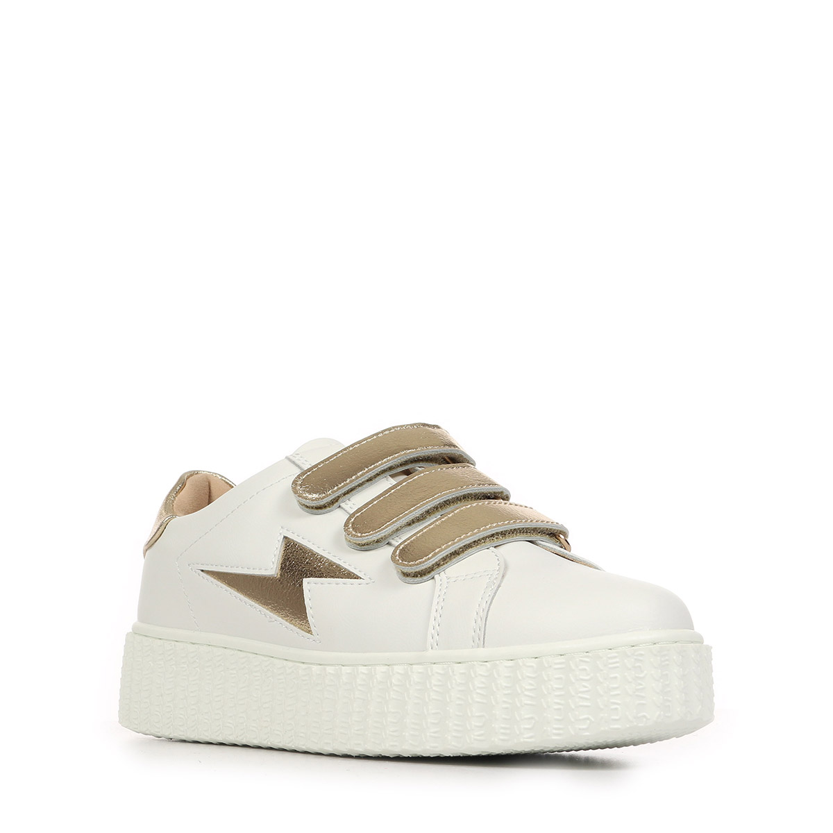 Plus produit : - Couleur : Blanc, Doré - Matière : Synthétique avec doublure textile - Fermeture : Scratchs pour un enfilage facile - Hauteur : Chaussures basses avec talons plats - Semelle intérieure : Amovible en textile et semelle extérieure en caoutchouc