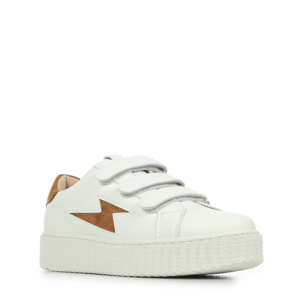Plus produit : - Baskets en similicuir blanc - Découpe en forme d'éclair et patch arrière en suédine camel - Fermeture à scratchs blancs - Bout rond - Semelle creepers blanche
