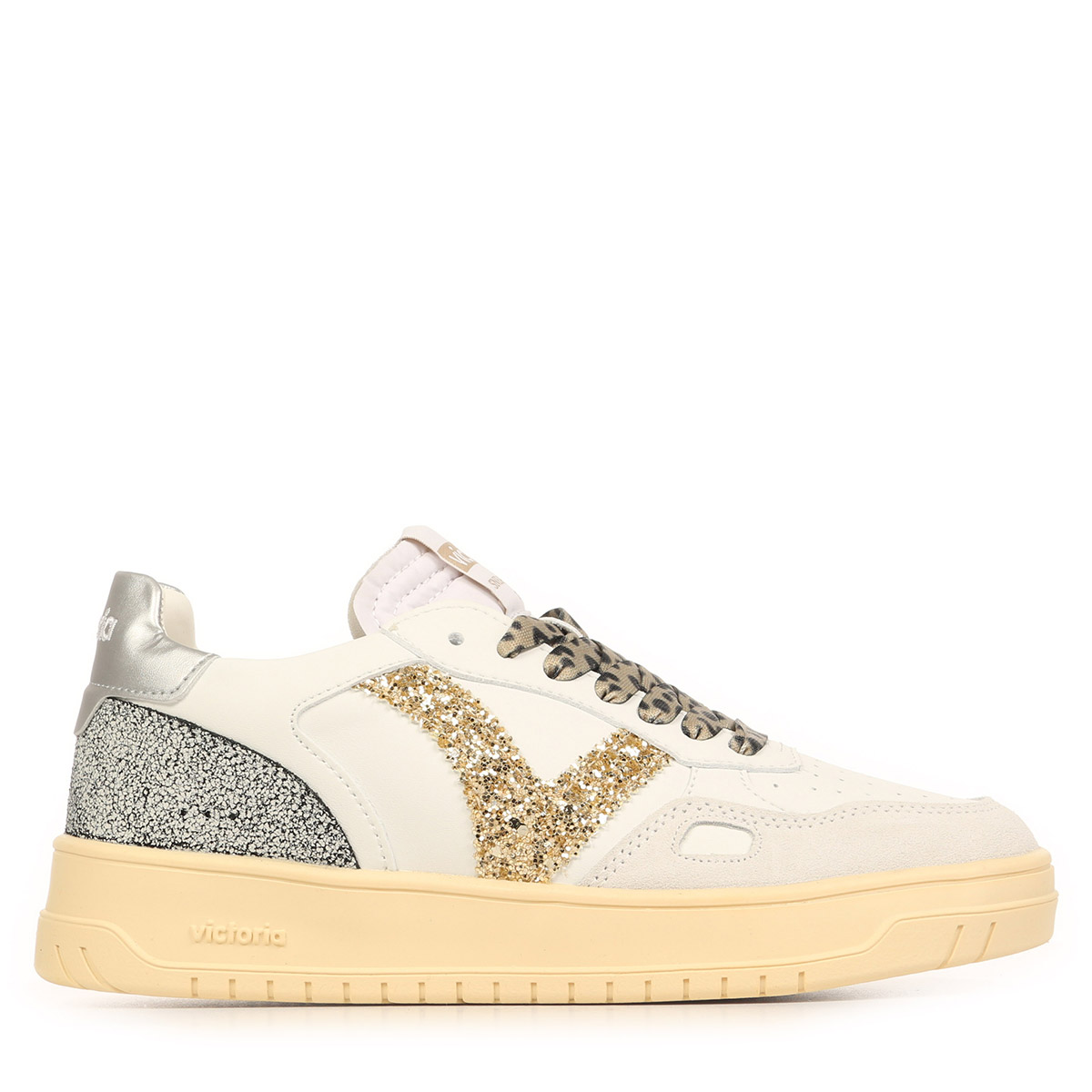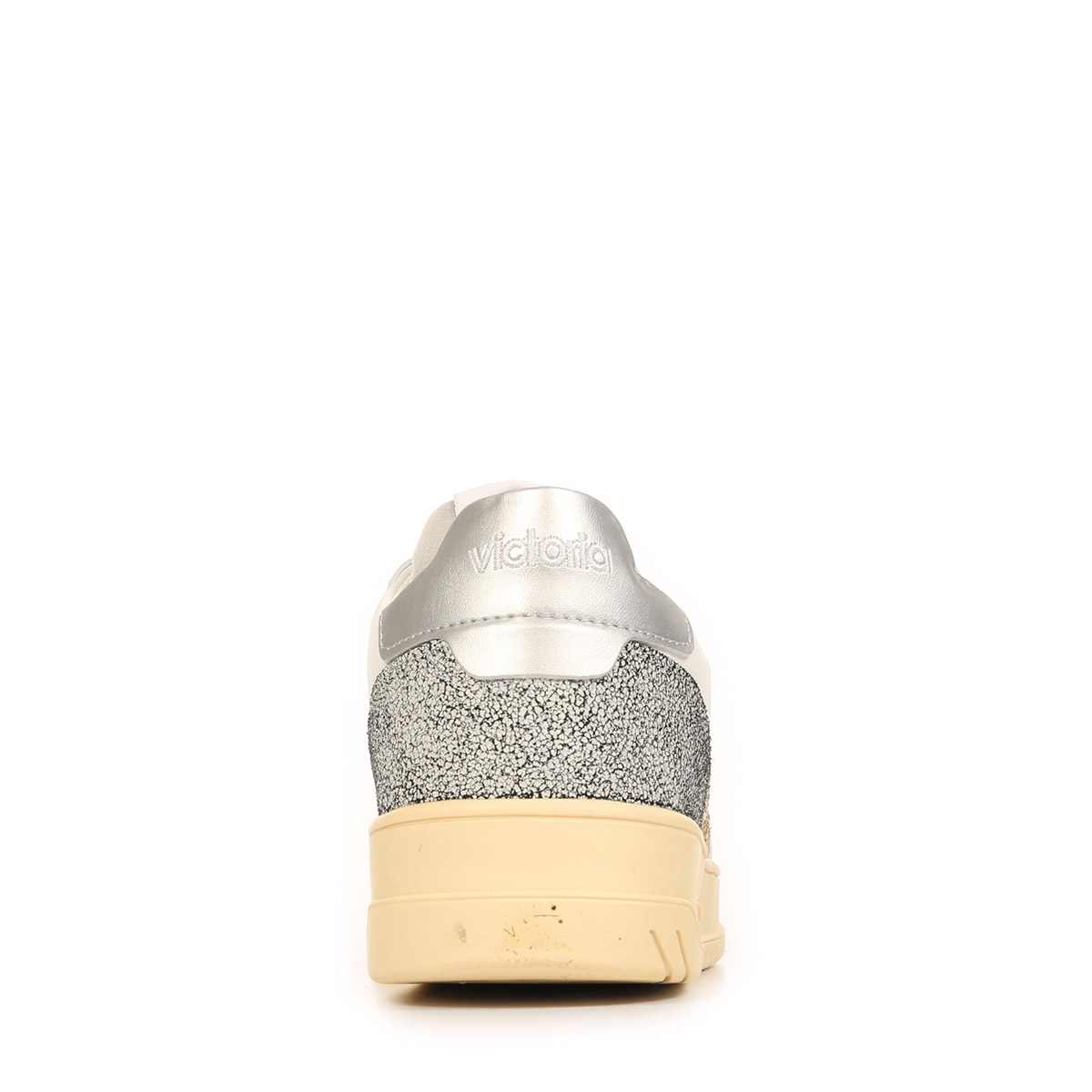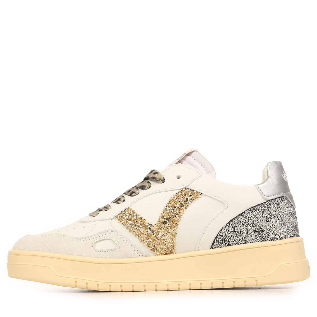 Baskets sport pour femme fabriquées en effet cuir blanc avec des pièces fantaisie et en daim. V de victoria latérale et pièce arrière en glitter, et contrefort métallisé avec le logo de la marque gravé en blanc.