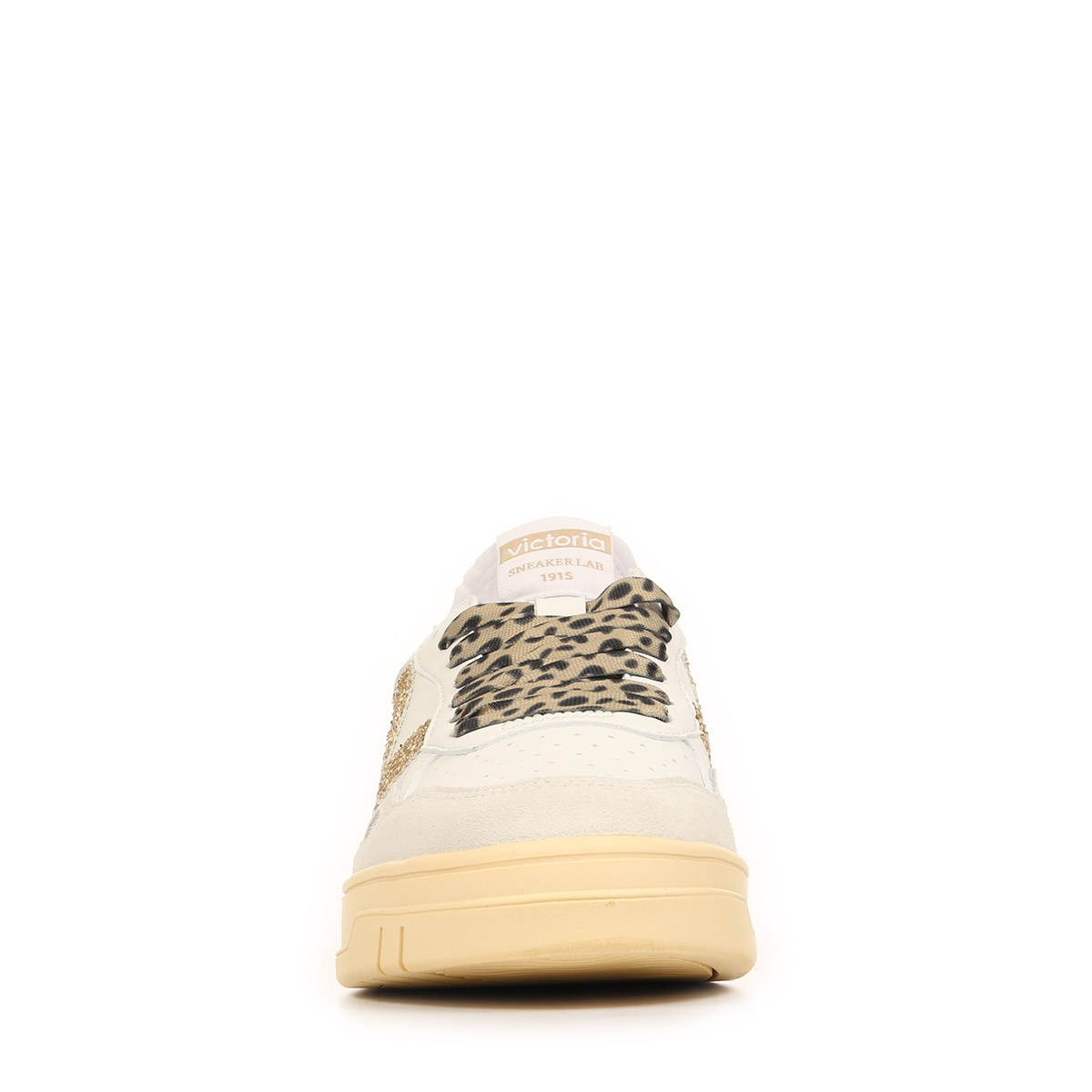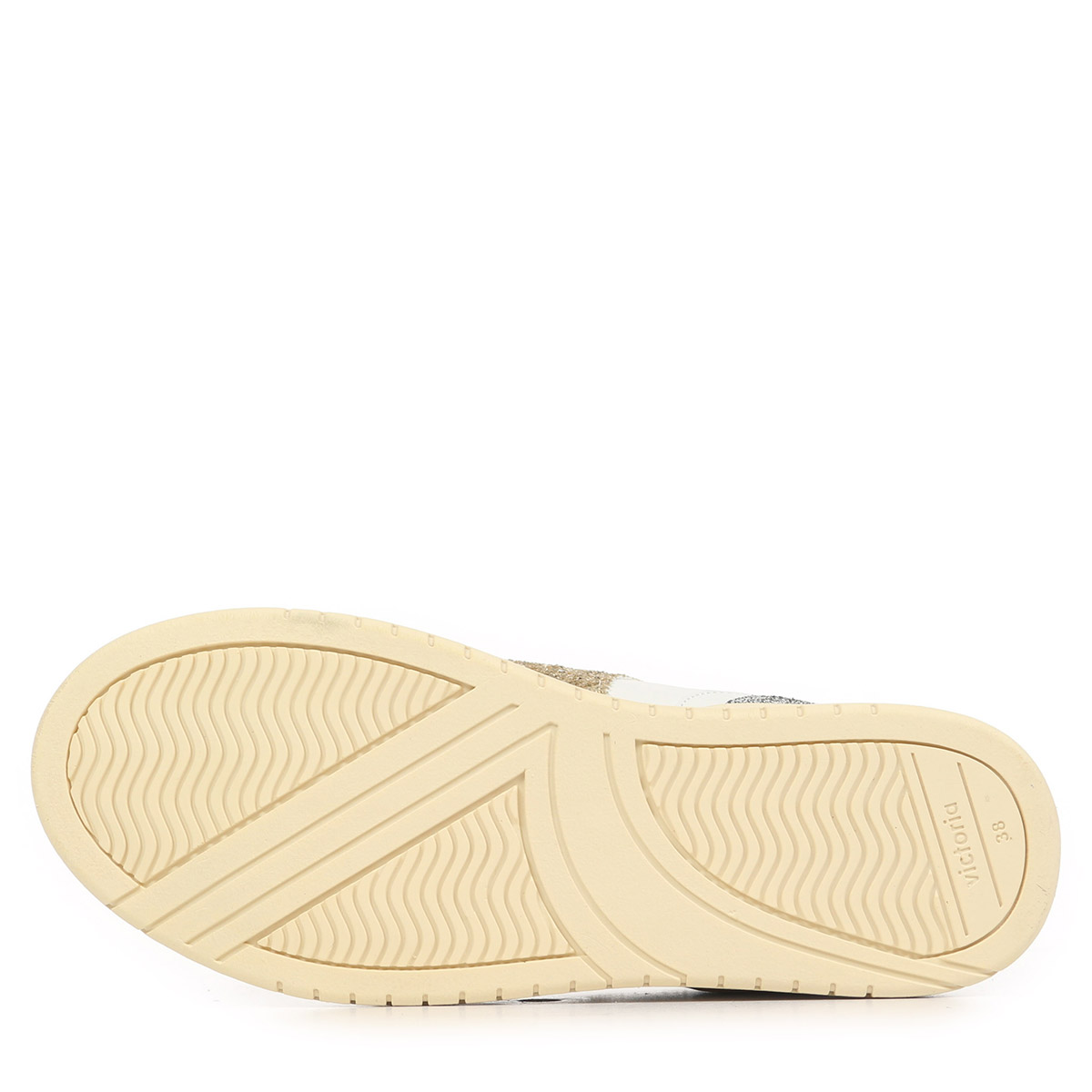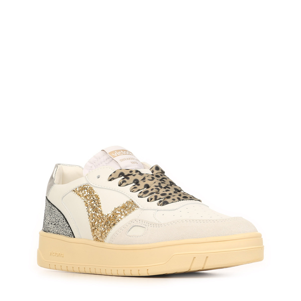 Baskets sport pour femme fabriquées en effet cuir blanc avec des pièces fantaisie et en daim. V de victoria latérale et pièce arrière en glitter, et contrefort métallisé avec le logo de la marque gravé en blanc.